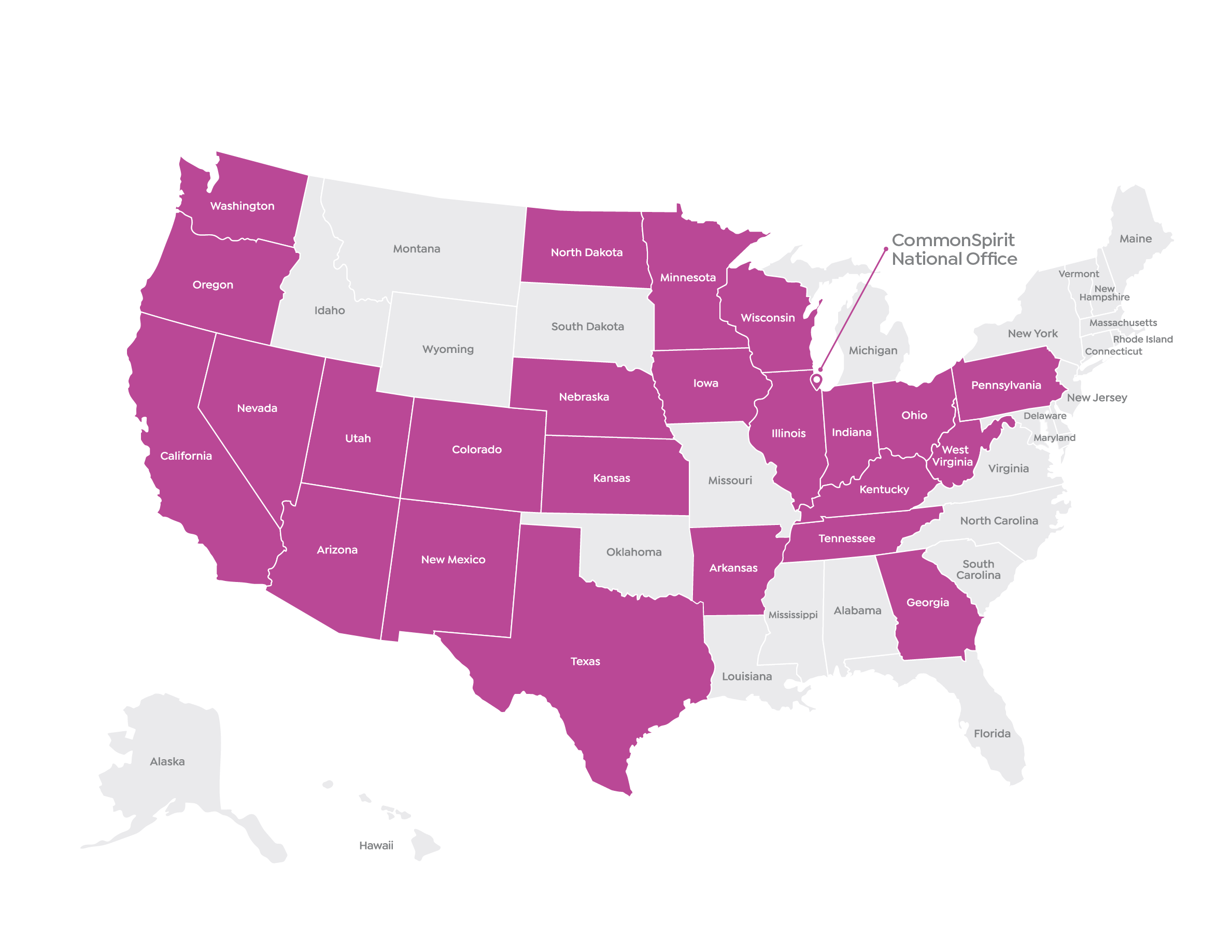 Image Description: A map of the United States. CommonSpirit National Office: Chicago, IL. The following states are highlighted: Washington, Oregon, California, Nevada, Arizona, Utah, Colorado, New Mexico, Texas, Kansas, Nebraska, North Dakota, Minnesota, Iowa, Alabama, Tennessee, Kentucky, Illinois, Wisconsin, Indiana, Ohio, Pennsylvania, West Virginia and Georgia.